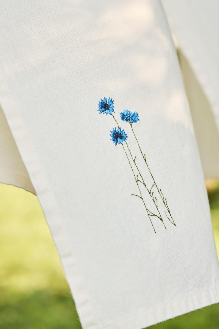 Kreemikas salvrätik rukkililledega, mis lisab igale söögilauale õrna elegantsi ja suvise meeleolu. Kaunis siniste rukkilillede broderii lisab esteetilist detaili, olles nii praktiline kui ka dekoratiivne.