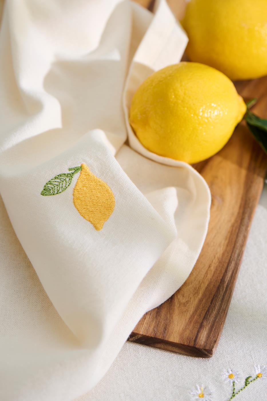Kreemikas salvrätik sidruni motiiviga, mis lisab toidulauale suvise meeleolu. Kauni sidruni tikandi detailiga rätik sobib ideaalselt kergete ja värskete toitude nautimiseks.