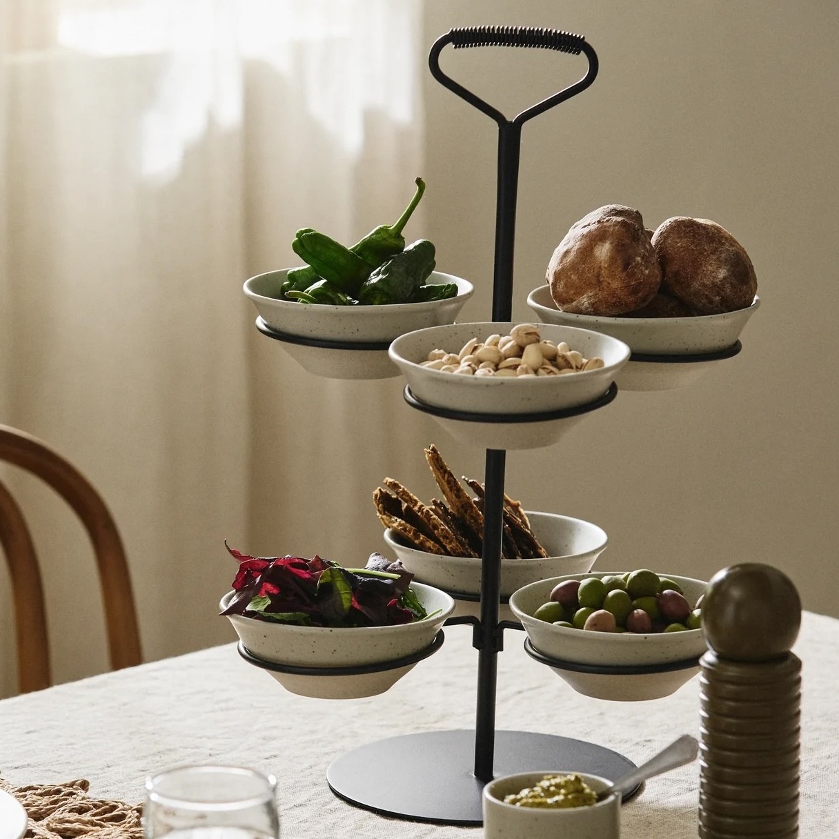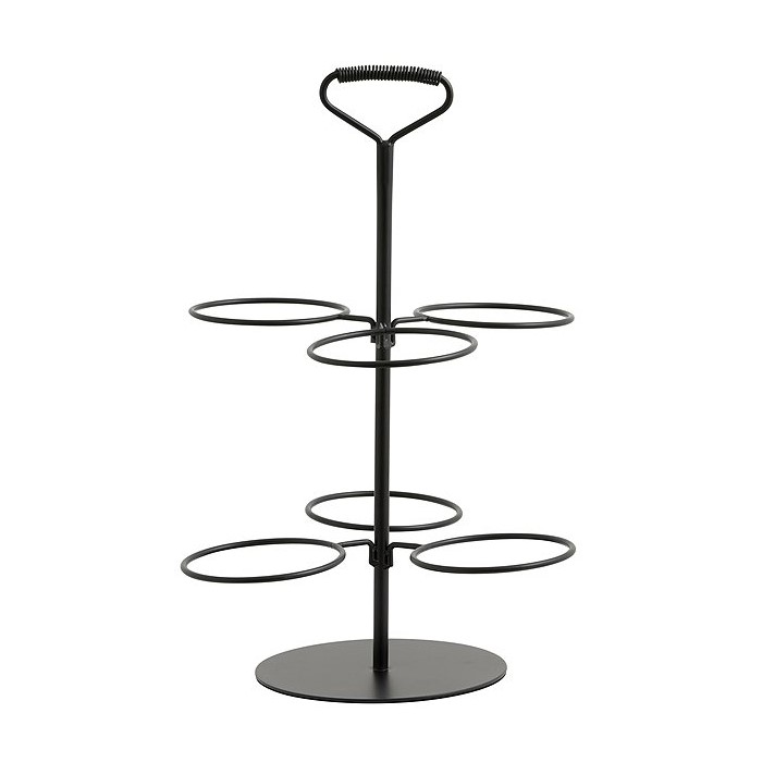 Stiilne ja praktiline serveerimisalus Primula, mis toob lauale struktuuri ja visuaalset kõrgust. Musta lakiga rauast valmistatud serveerimisalus on varustatud kuue ühtlaselt jaotatud rõngaga, mis võimaldavad serveerida erinevaid roogasid kompaktselt ja elegantselt. Sobib suurepäraselt snäkkide, hommikusöögi või tapase esitlemiseks.