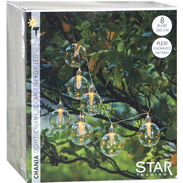 Chania on elegantne päikesepaneeliga valguskett, mis loob hubase meeleolu aias, terrassil või paviljonis. Kett koosneb kaheksast suuremast läbipaistvast kuplist (läbimõõt 8 cm), mille sees paikneb hajutava pinnaga element – see muudab sooja LED-valguse pehmeks ja meeldivaks. Eraldiseisev päikesepaneel võimaldab valguskett paigutada ka varjulisse kohta, suunates paneeli päikesevalguse kätte.