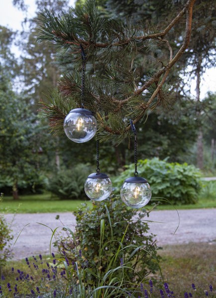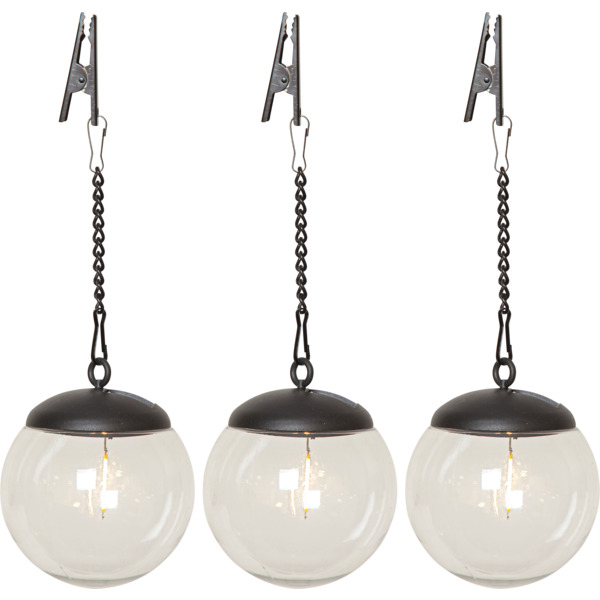 Globus riputatavad solarvalgustid loovad dekoratiivse ja hubase õhkkonna aias, rõdul või terrassil. Komplektis on kolm läbipaistvast PS-plastikust valguskuuli, mille sees asub sooja valget valgust kiirgav LED-filament. Iga valgusti on varustatud ketiga ja krokodilliklambriga lihtsaks riputamiseks. Päikesevalgus laeb päeva jooksul aku, mis võimaldab valgustil õhtul automaatselt süttida.