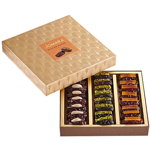 Jomara täidetud datlid on luksuslik maius, valmistatud mahepõldudel kasvatatud kõrgekvaliteedilistest datlitest. Gurmeepähklite ja apelsinikoorega täidetud datlid pakuvad täiuslikku kooslust looduslikust magususest, värskest tsitrusenoodist ja krõmpsuvast tekstuurist. Datlid on looduslikult rauarikkad ning kinkekarp teeb neist suurepärase kingi või pidupäevalaua maiuse.