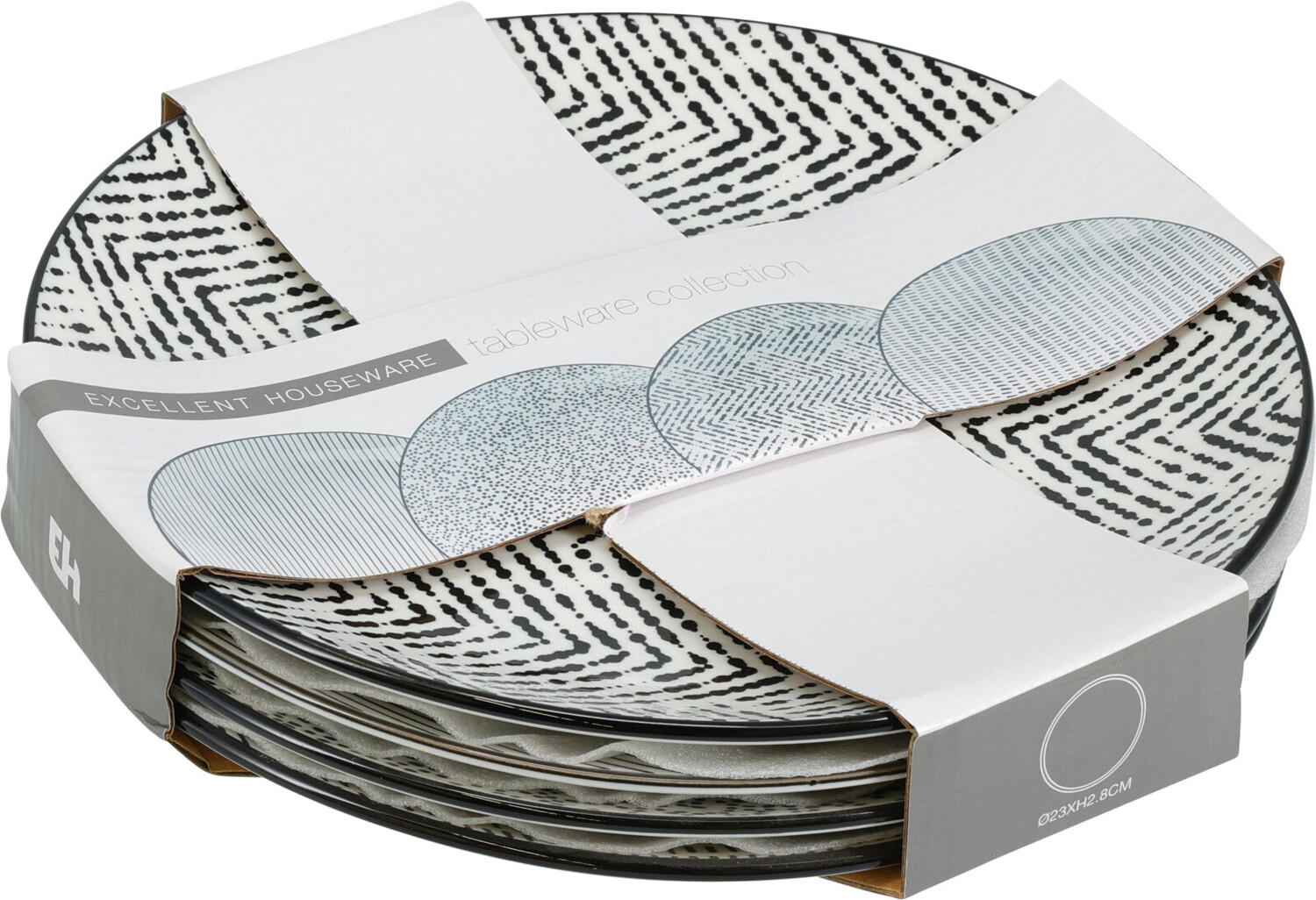 Portselanist taldrikute komplekt 4 tk on suuremad taldrikud, mis sobivad hästi põhitoitude serveerimiseks. Igal taldrikul on erinev mustvalge muster, mis annab lauale vaheldusrikka, kuid ühtse ilme. Vastupidav portselan sobib igapäevaseks kasutamiseks ning on lihtsasti hooldatav.