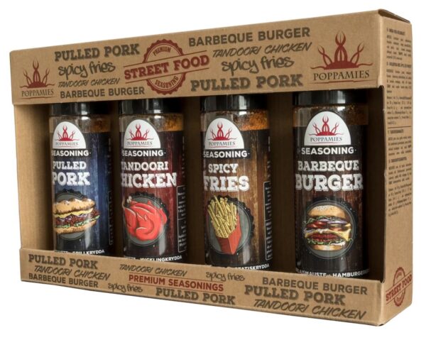 Poppamies tänavatoidu vürtside komplekt (4 x maitseainet). Tõsta oma tänavatoidud järgmisele tasemele selle neljast vürtsisegust koosneva komplektiga, mis sobib ideaalselt friikartulite, burgerite, sealiharoogade ja kanaga. Maitserikkad segud on loodud inspireerituna maailmaköökidest, pakkudes mitmekesist kasutust nii grillimisel kui igapäevases toiduvalmistamises.