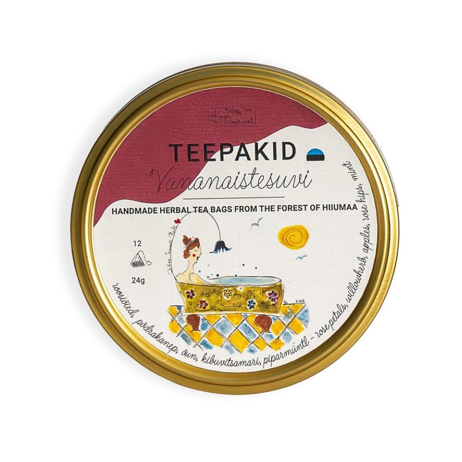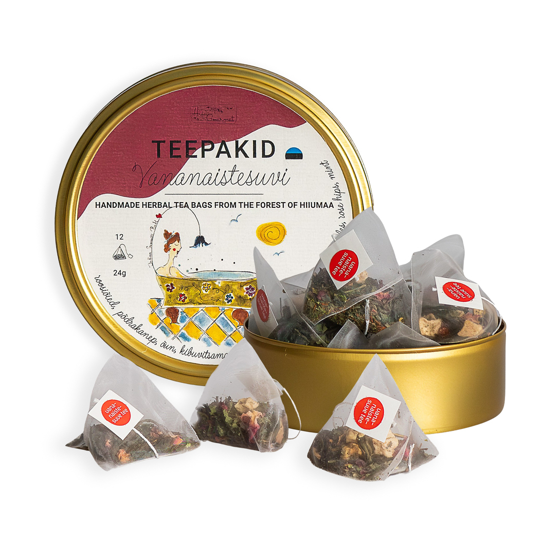 Vananaistesuvi tee Hiiumaalt, teepakid 12 x 2 g. Tassitäis Hiiumaa sooja vananaistesuve – rahustav, noorendav ja südant soojendav. Mahedatest taimeteest pakatav segu toob sinuni saare metsade ja aasade parimad maitsed, õrna roosiaroomi ja piparmündi värskuse.