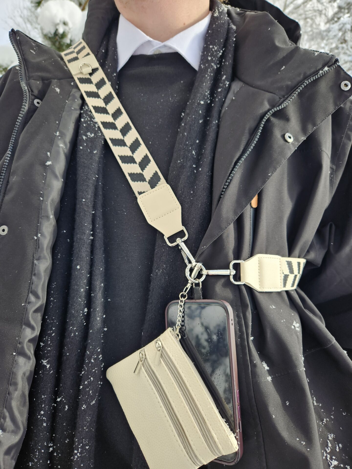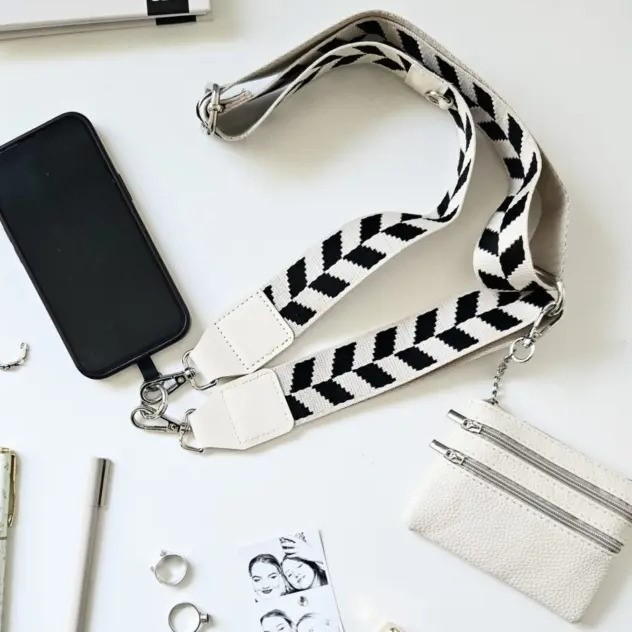 Telefonipael “Beige & Black Bliss” koos väikese rahakotiga. Lai, kontrastse mustriga telefonipael võimaldab kanda telefoni mugavalt üle õla või kaela, jättes käed vabaks. Paelaga on kaasas kinnitatav väike rahakott, kuhu saab paigutada olulised pisiasjad – kaardid, võtmed või sularaha.
