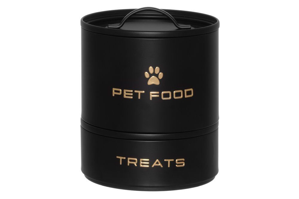 Praktiline ja ruumisäästlik lahendus lemmikloomatoidu ning maiustuste ühiseks hoiustamiseks. Komplekt koosneb kahest virnastatavast tsingitud terasest nõust, mille silikoontihenditega kaaned tagavad sisu värskuse ja kaitsevad seda niiskuse eest. Alumist, 2,5-liitrist osa saab vajadusel mugavalt kasutada toidukausina. Musta värvi korpust kaunistab kontrastne kuldne käpakujutis.