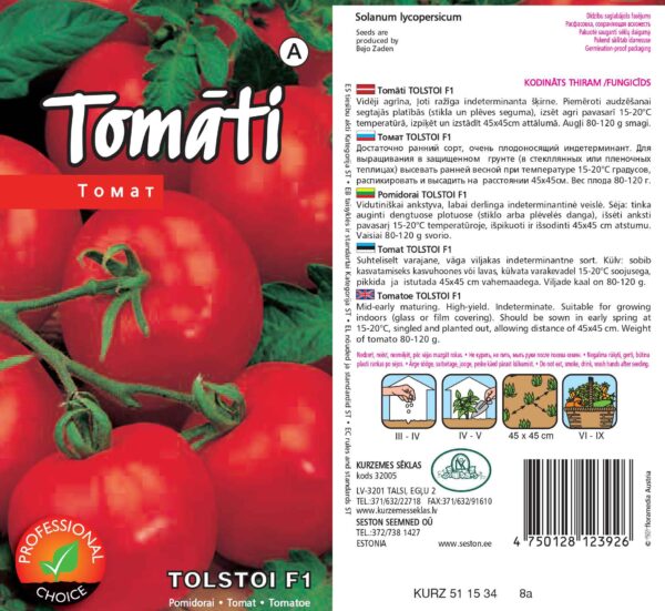 Harilik tomat ‘Tolstoi’ on keskvarajane, kiire- ja kõrgekasvuline sort, mis on hinnatud oma suure ja ühtlase saagikuse poolest. Taim moodustab tugevad kobarad 80–120 g kaaluvate, punaste ja väga maitsvate viljadega. Tomatid on tugevakoelised, hea säilivusega ning sobivad nii värskelt tarbimiseks kui ka viilutamiseks ja hoidistamiseks. Sort on haigustele hästi vastupidav ja sobib kasvatamiseks nii kasvuhoones, kus taimed vajavad toestamist. Tootepilt on illustratiivne.
