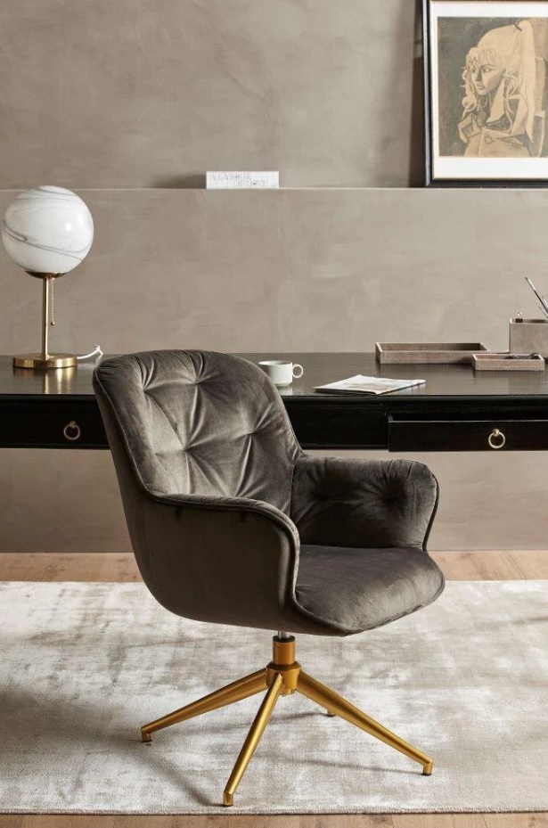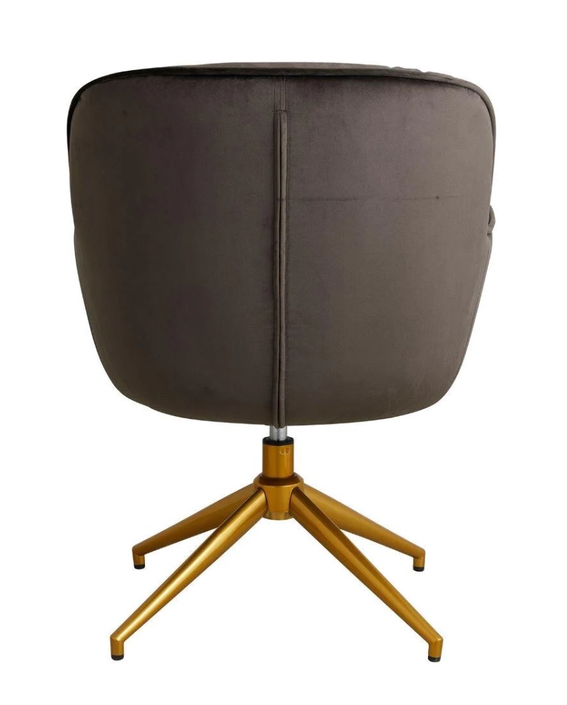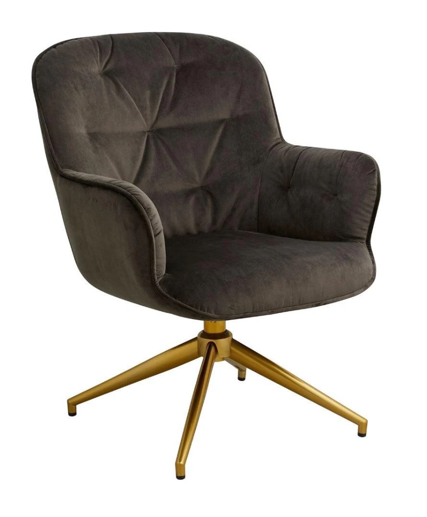 Lea kontoritool on polsterdatud helepruuni sametiga ja kuldse metallist raamiga.