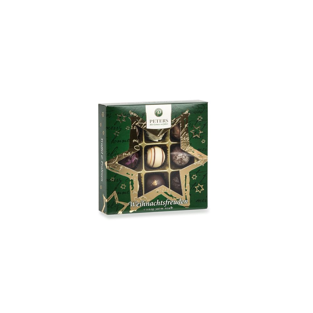 Üheksa pralineed ja trühvlit kvaliteetses kuldse tähega rohelises jõulupakendis.