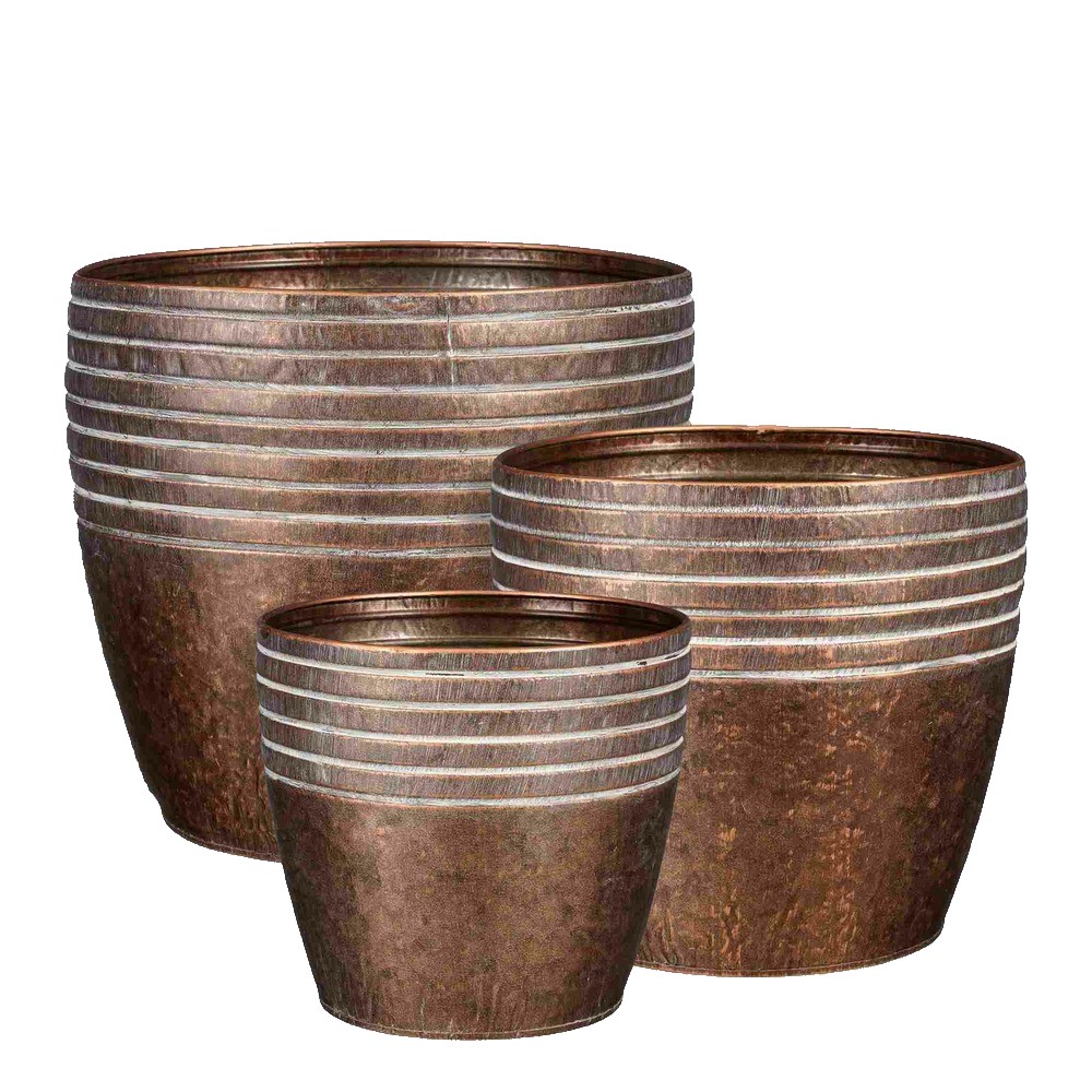 Selge joonega ja kergelt avarduva kujuga tsinkpott Ricardi on ühtlase vormiga ümbrispott, mille ülaosas olev reljeefne muster annab pinnale rütmi. Metallviimistlus lisab sügavust ning jätab üldmulje rahulikuks ja tasakaalukaks.