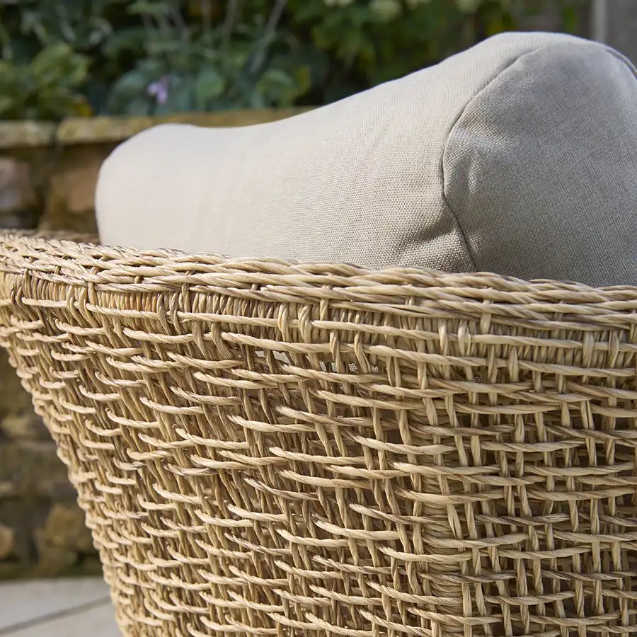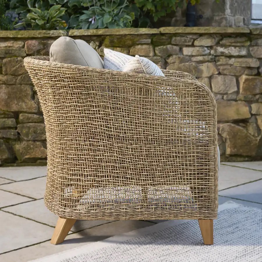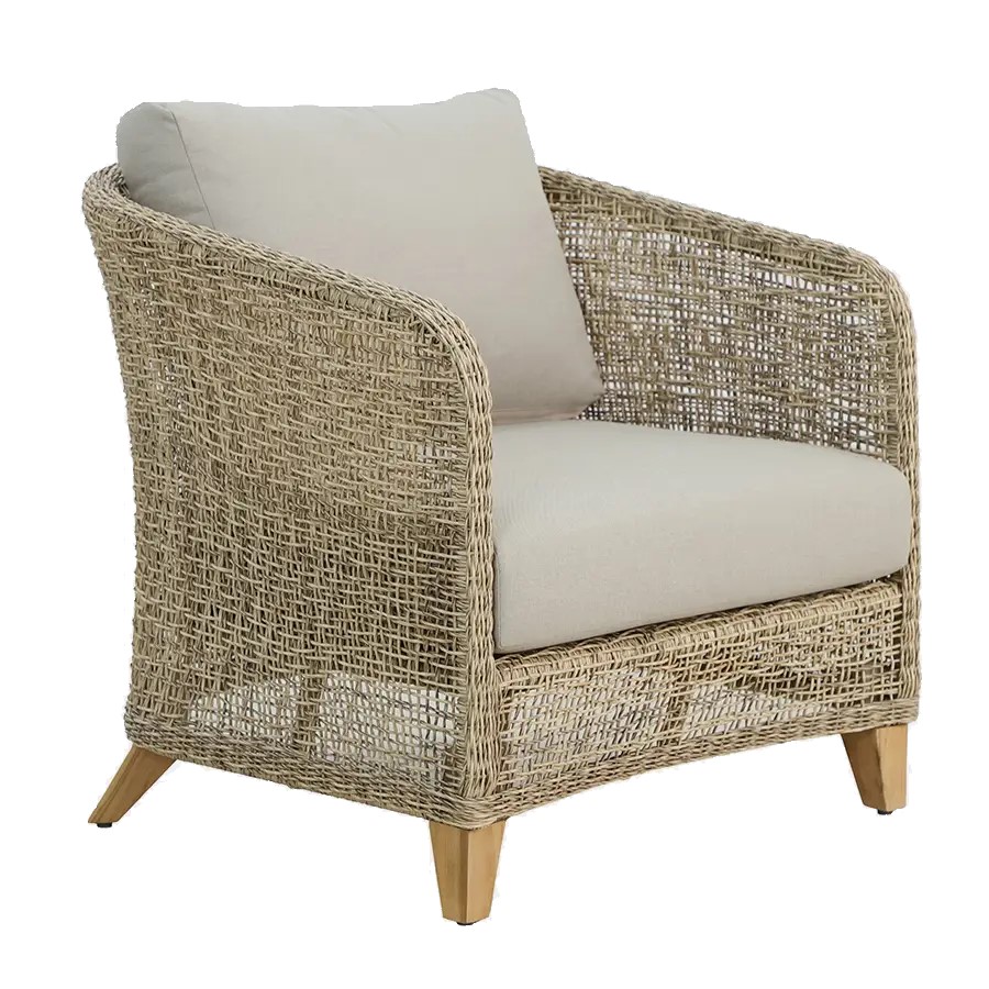 Durban on tugitool, mis ühendab ajatu stiili ja erakordse mugavuse. Käsitsi punutud sünteetiline viimistlus mererohu efektiga ning vastupidav FSC-sertifikaadiga tiikpuust raam loovad elegantse ja looduslähedase koosluse, mis sobib ideaalselt nii koju kui ka õue. Sügavad, pehmed padjad pakuvad maksimaalset lõõgastust igas keskkonnas.