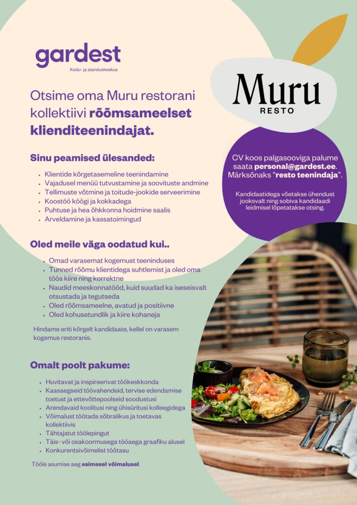 Kui hetkel sobivat tööpakkumist ei leidu või soovid tööle tulla osalise koormusega, anna meile endast märku! Kirjuta personal@gardest.ee ja vaatame üle, millised võimalused võiksid Sulle sobida.