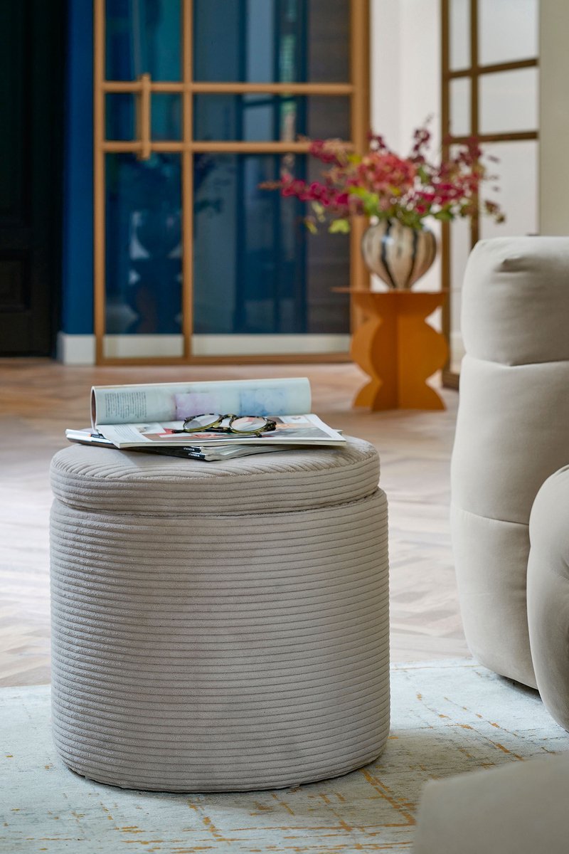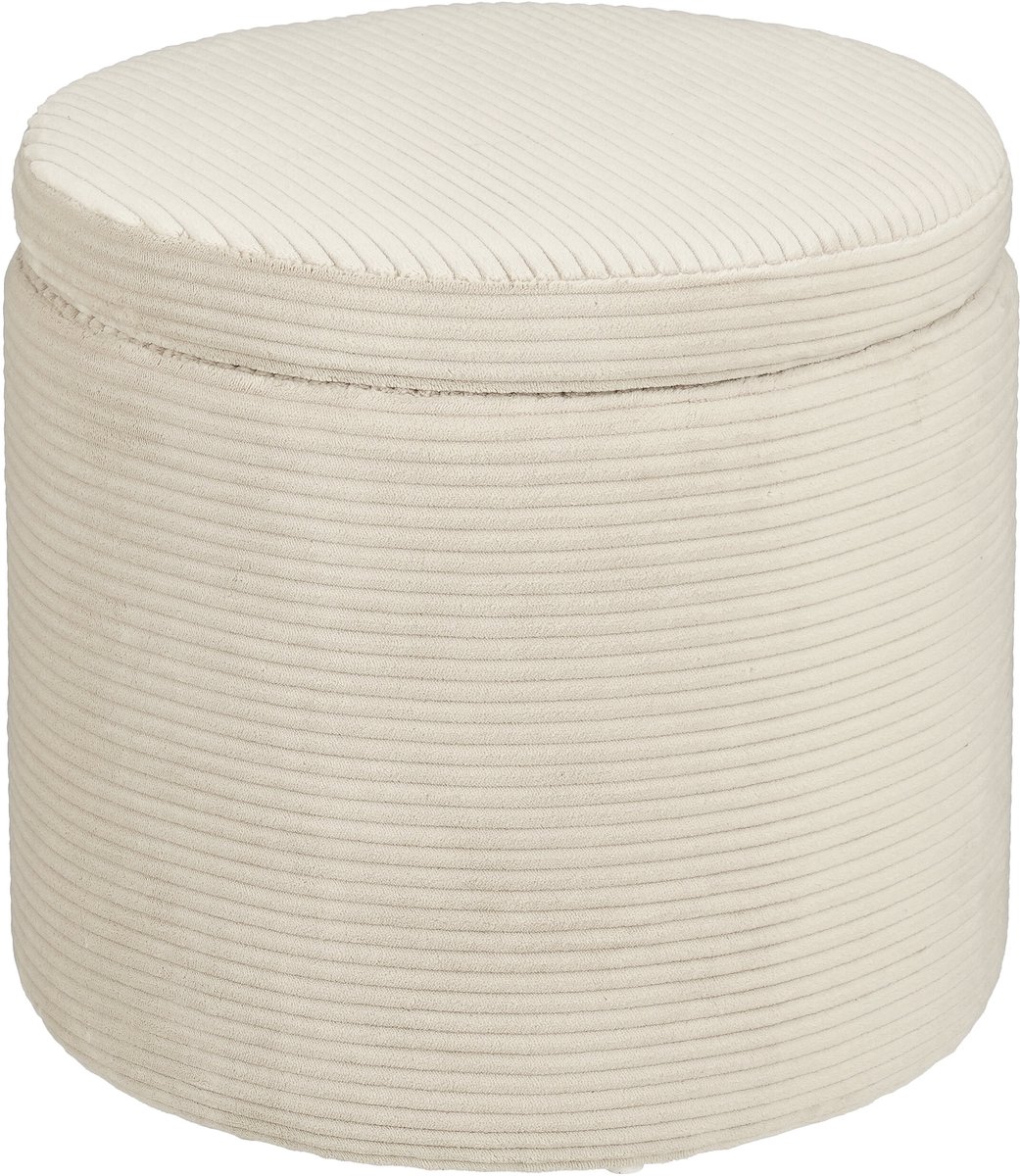Praktiline ja mitmeotstarbeline tumba, mille ümara vormi ja pehme polsterduse all peitub mahukas panipaik. Hele valge kangas loob neutraalse ja kergesti sobituva ilme, mis täiendab hästi nii kaasaegset kui klassikalisemat interjööri. Tugev puitraam tagab vastupidavuse, eemaldatav kaan võimaldab hoiustada pleede, patju või mänguasju ning hoida ruumi korrastatuna. Sobib lisaistekohaks, jalatoeks või väikseks kõrval- ja abilauaks.