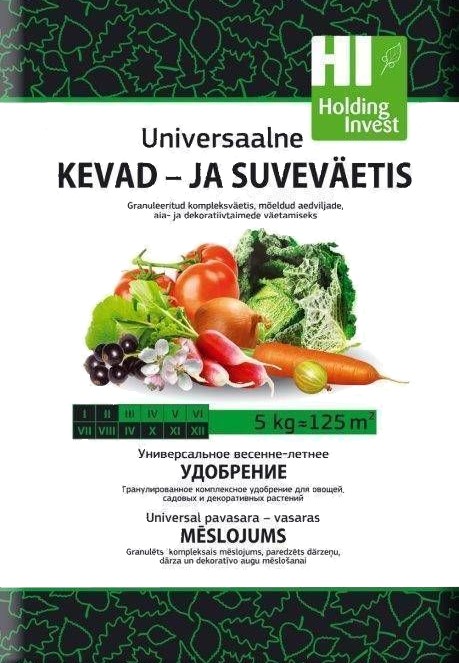 Universaalne kevad- ja suveväetis on tõhus granuleeritud kompleksväetis köögiviljadele, marjapõõsastele ja dekoratiivtaimedele. Sobib kasutamiseks kevadest suve lõpuni, toetades taimede tervislikku kasvu, lopsakat õitsemist ja rikkalikku saaki.