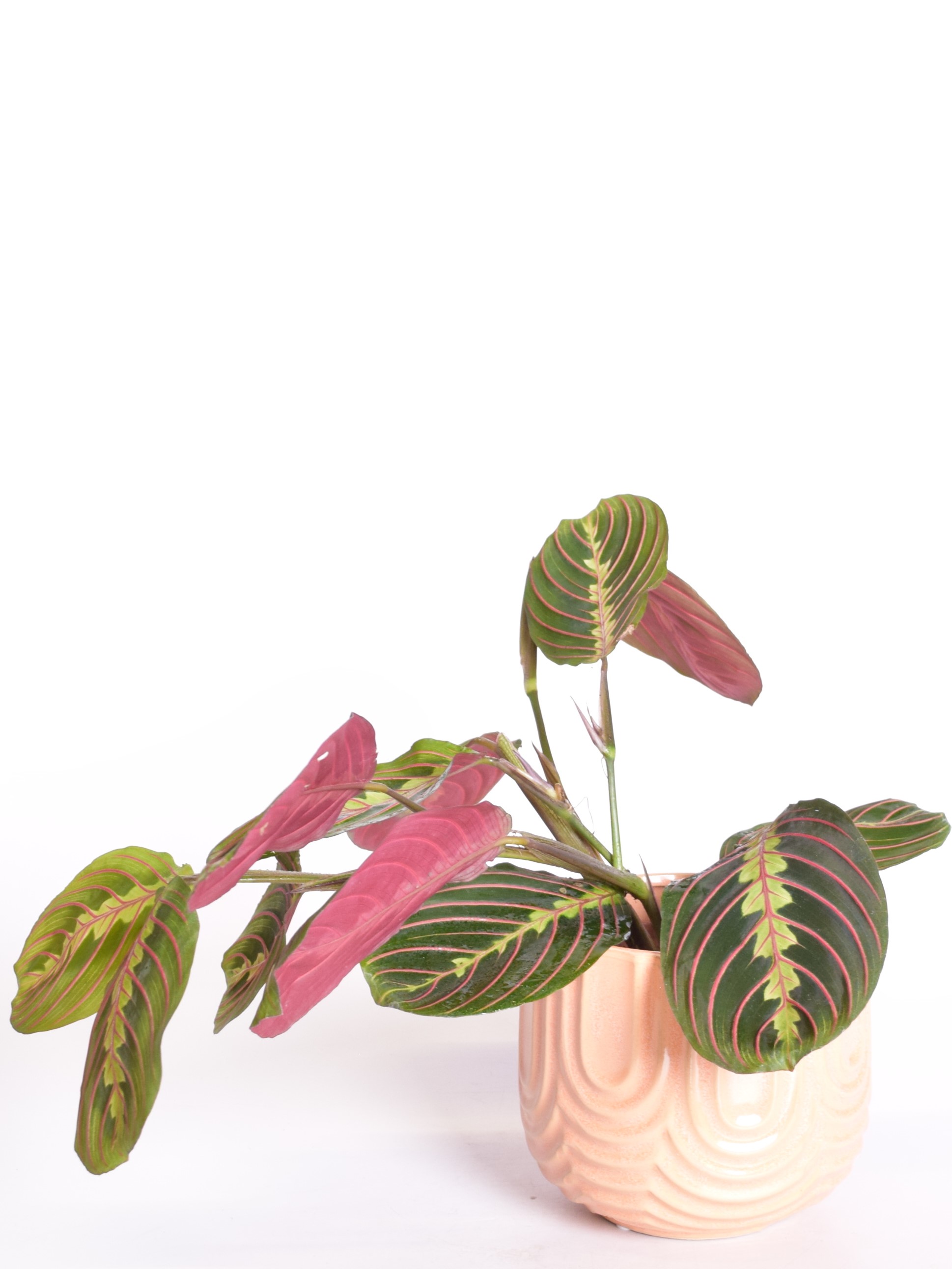 Valgeroodne maranta ‘Fascinator’ on kompaktne “palvetajataim” tumeroheliste lehtedega, mida läbivad roosakas-punased rood ja heledamad laigud. Lehe alumine külg on lillakas. Päeval on lehed laialt avatud, õhtul tõusevad püsti “palveasendisse”. Sobib aknalauale, riiulile ja madalatesse kompositsioonidesse. Eriti hea valik kõrgema õhuniiskusega ruumidesse.