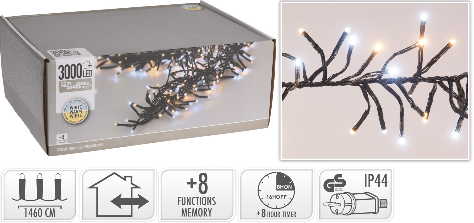 Suurejooneline 22-meetrine valguskett 3000 LED-tulega ühendab soe ja külm valge valguse, tuues ruumi korraga nii hubasust kui kirkust. Eri suundades hargnevad oksakujulised valgusnarmad loovad ruumilise ja tiheda valgusefekti, mis sobib suurepäraselt suuremate pindade nagu fassaadid, terrassid, aiad või rõdud dekoreerimiseks.