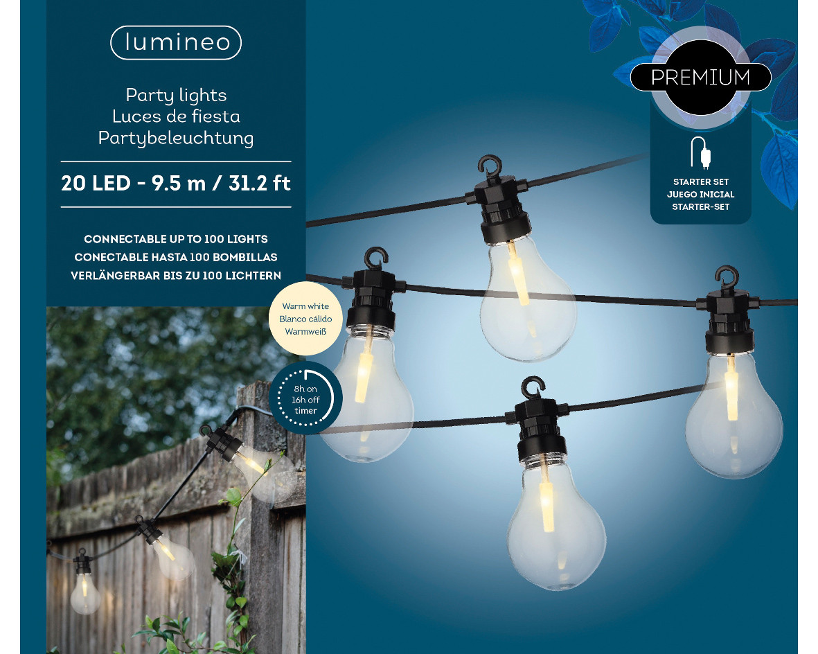 Valguskett on kerge, energiasäästlik ja lihtsalt paigaldatav. Iga 6 cm läbimõõduga pirn on varustatud kinnitusaasaga, et seda oleks mugav riputada. Sisseehitatud 8-tunnine taimer võimaldab valgust automaatselt sisse ja välja lülitada. IP44 kaitseklass tagab ohutu kasutamise välitingimustes.
