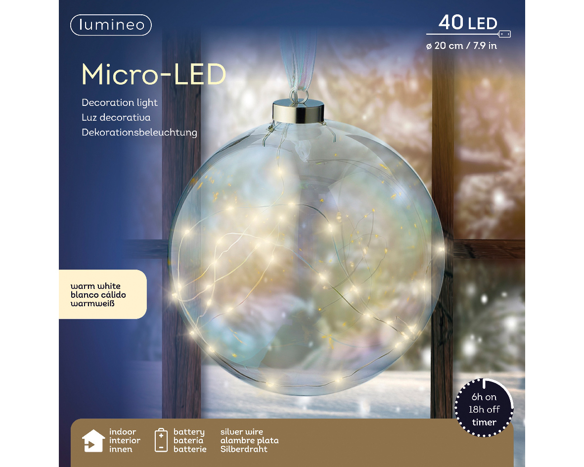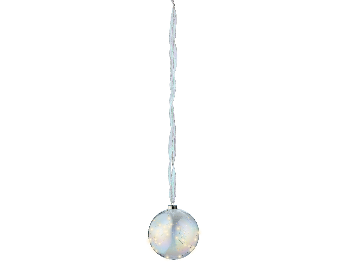 Hõbedane valguspall loob ruumi elegantse ja hubase meeleolu. Läbipaistev iriseeriva efektiga klaas ning soe valge LED-valgus lisavad dekoratsioonile erilise sära, muutes selle pilkupüüdvaks detailiks nii pidulikes kui ka igapäevastes interjöörides. Sobib ideaalselt rippkaunistuseks, lauadekoratsiooniks või aknalauale.
