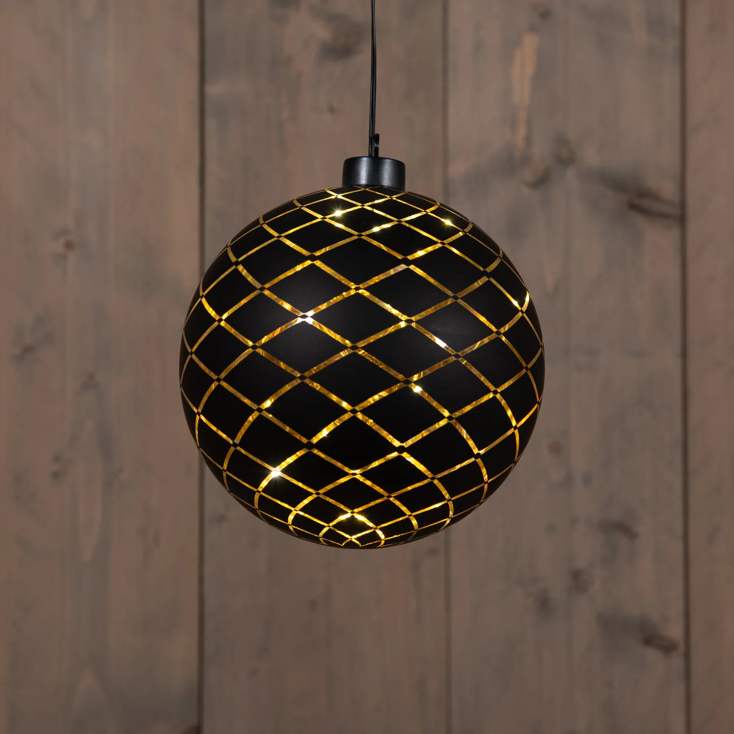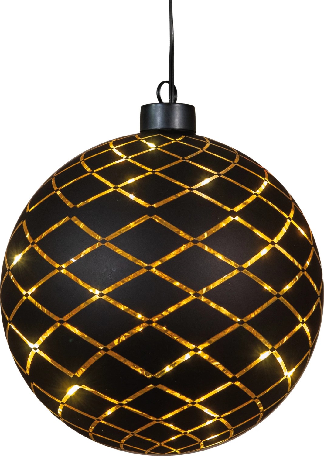 Must klaasist valguspall, mille pind on kaunistatud kuldse joonmustriga. Pallis asuvad soojad valged LED-tuled, mis kumavad mustrist läbi ja loovad huvitava valguse ja varju mängu. Sisseehitatud taimer tagab automaatse töötsükli – valgus süttib iga päev 6 tunniks ja seejärel lülitub 18 tunniks välja. Dekoratsioon sobib hästi kuuse külge, aknale või ukseavasse riputamiseks.