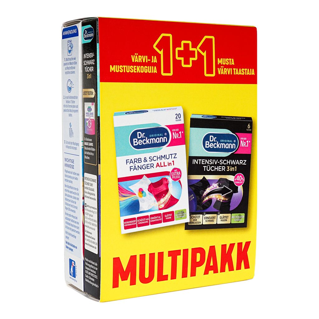 Praktiline Dr. Beckmanni multipakk ühendab kaks tõhusat pesulahendust ühes: värvi- ja mustusekogumise lapid ning mustadele ja tumedatele rõivastele mõeldud kangavärskendaja. Komplekt aitab hoida riided kirkad ja puhtad ka segapesu korral ning pikendab tumedate tekstiilide eluiga.