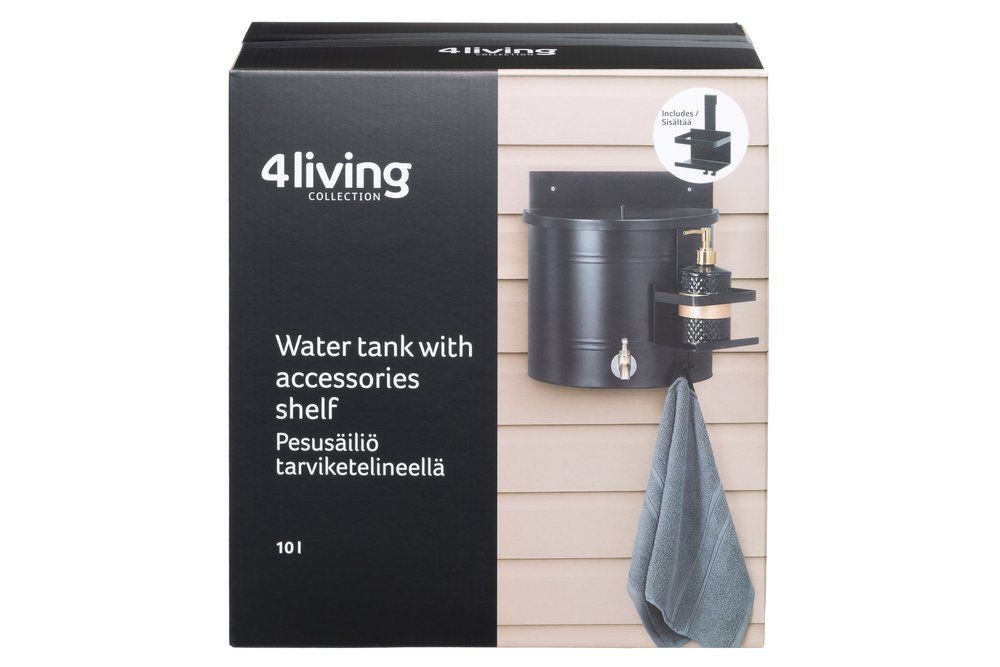 Veepaak 4Living 10 L on mugav lahendus käte pesemiseks ja vee kasutamiseks aias või suvilas. Seinale kinnitatav paak võimaldab vett lihtsalt kätte saada ilma püsiva veesüsteemita. Alumine riiul pakub ruumi seebi või muude tarvikute hoidmiseks. Sobib kasutamiseks välitingimustes.
