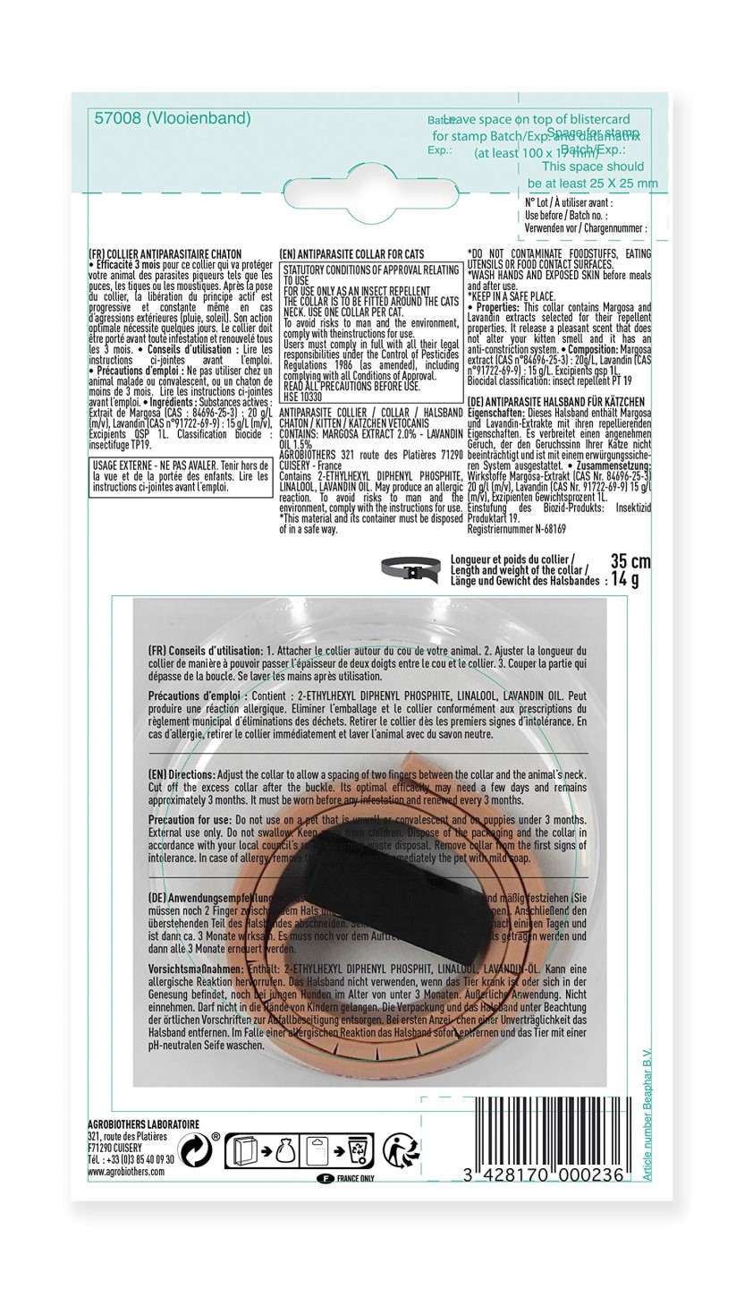 Koostisosad: 2-etüülheksüülidifenüülfosfiit, linalool, lavandiniõli – võib põhjustada allergilist reaktsiooni. Allergia korral eemaldage kaelarihm ja peske looma karvkate neutraalse seebiga.